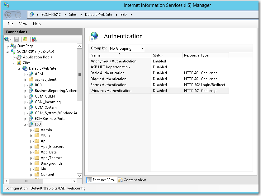 noteTo use single sign-on functionality, make sure that anonymous authentication is enabled in IIS for the ESD site and that Windows Authentication is disabled.