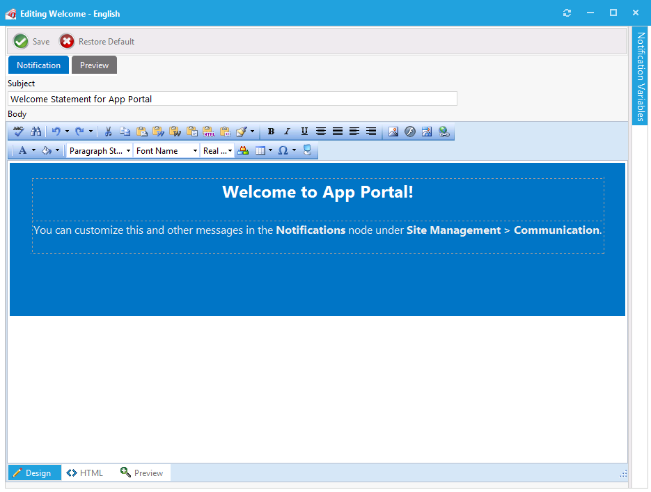 2. Under Site Management, select Communication > Notifications. The Notifications View opens.